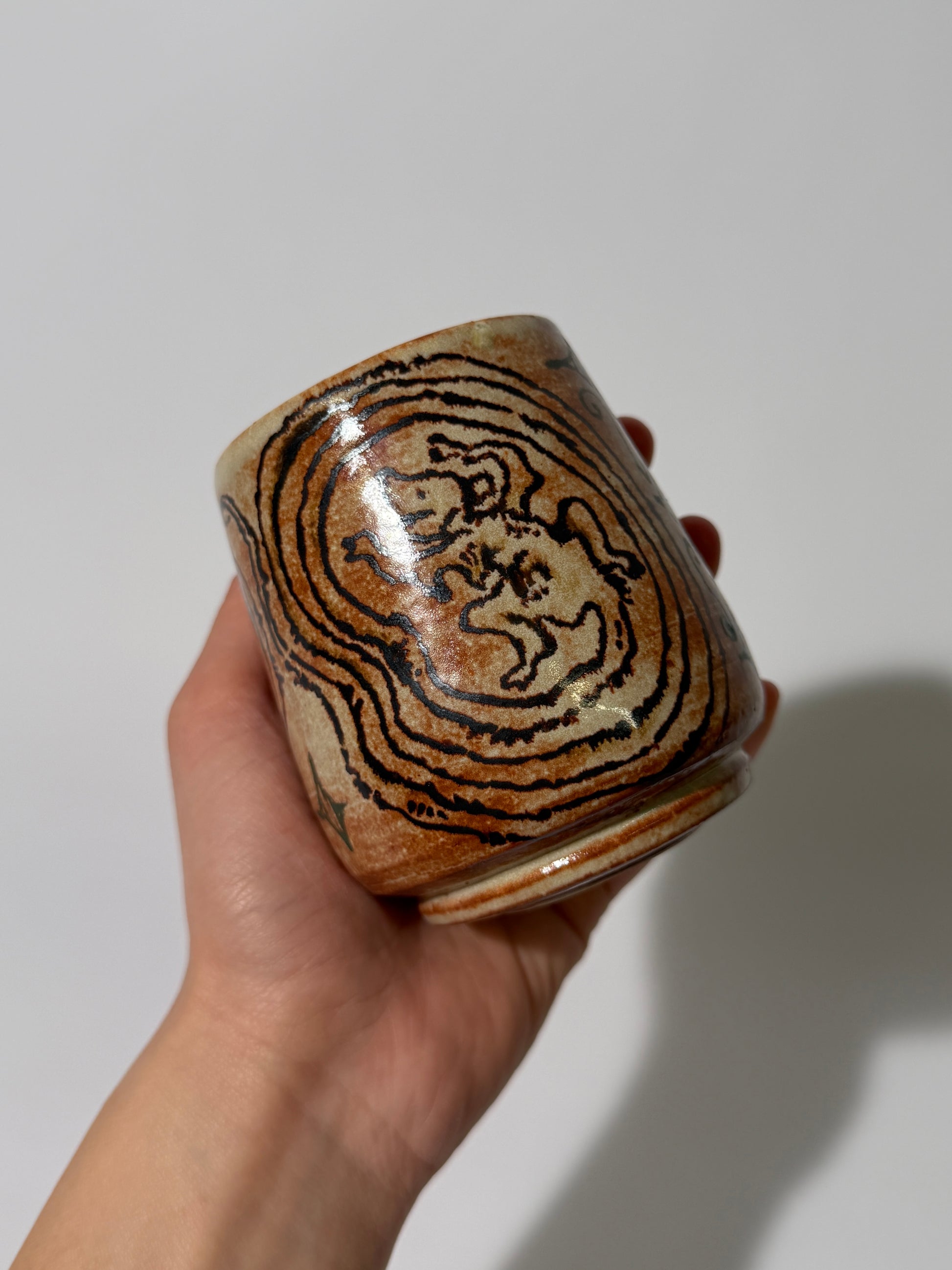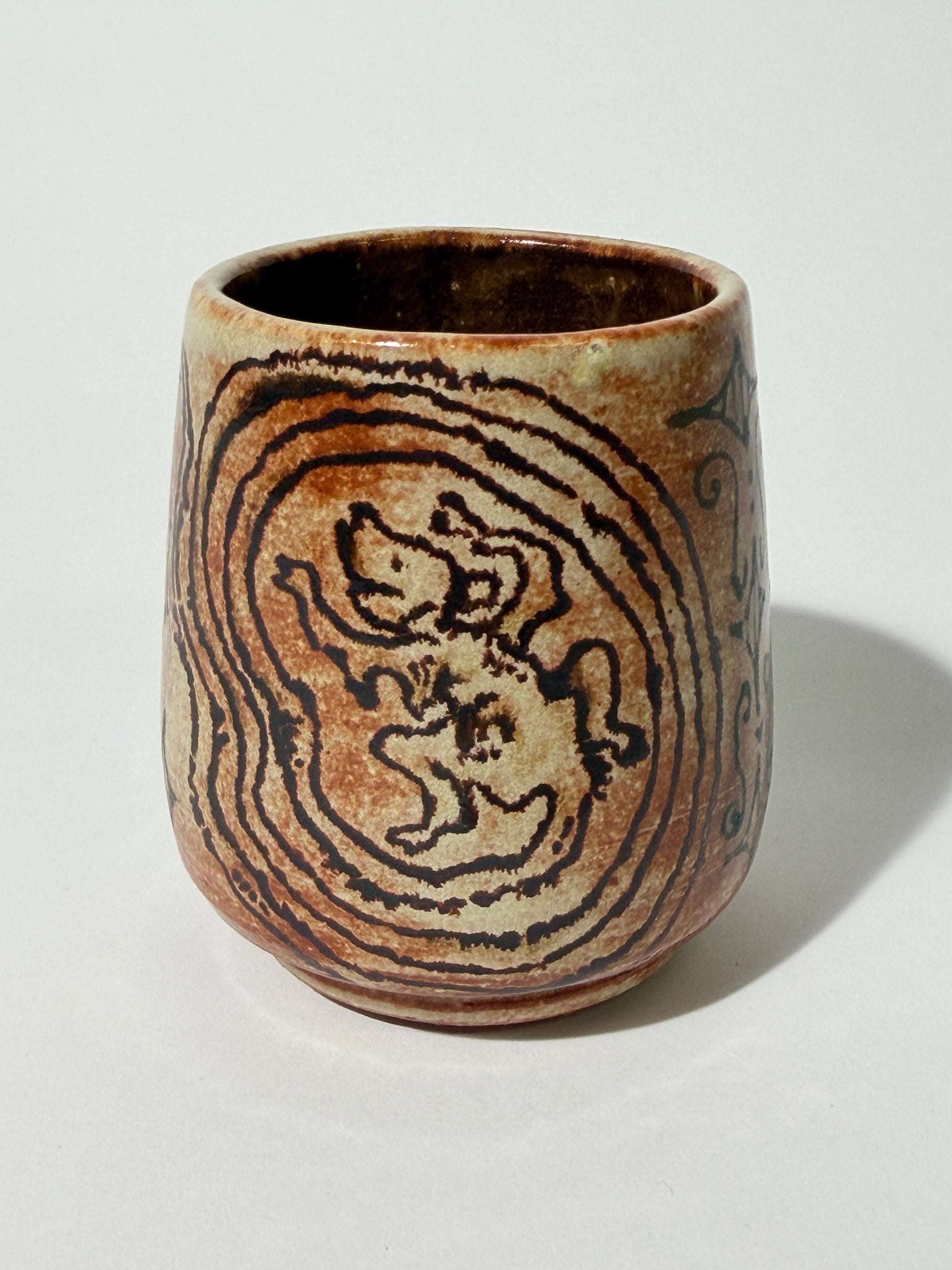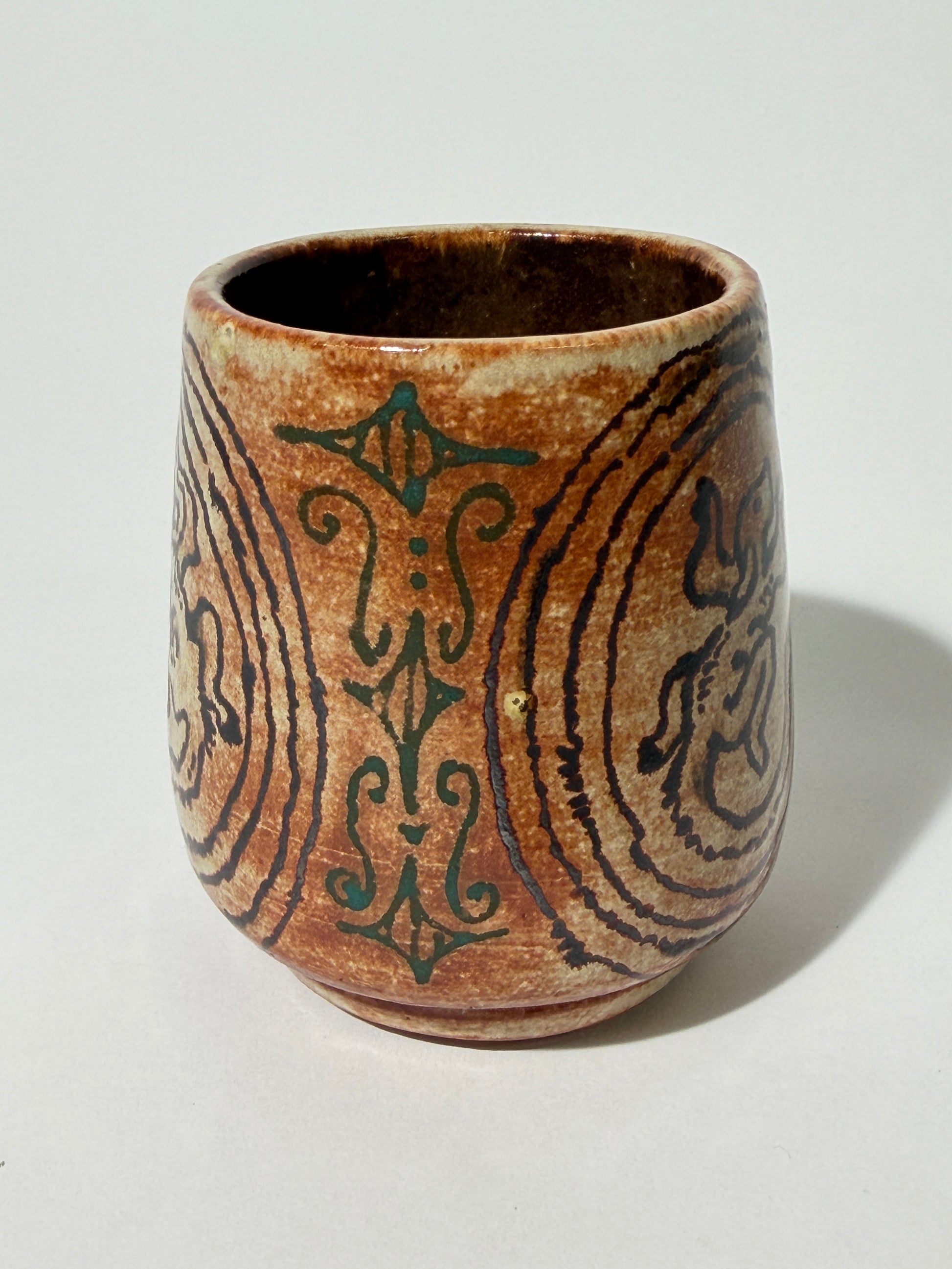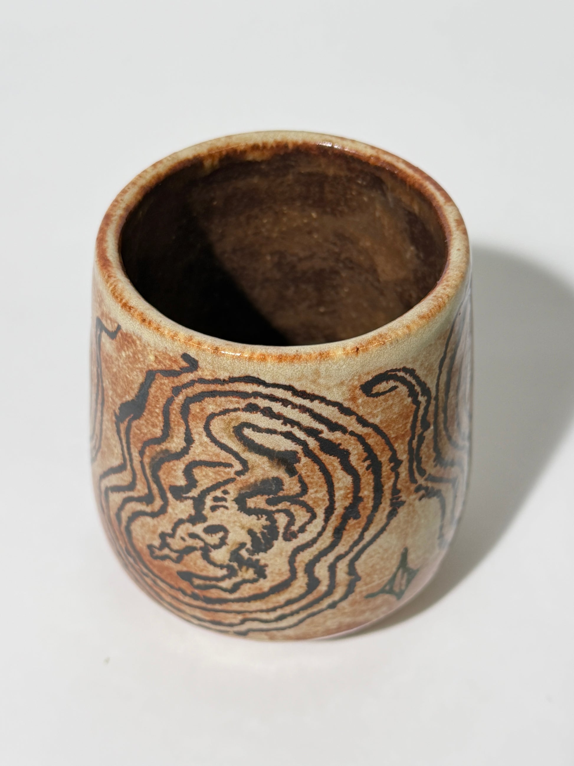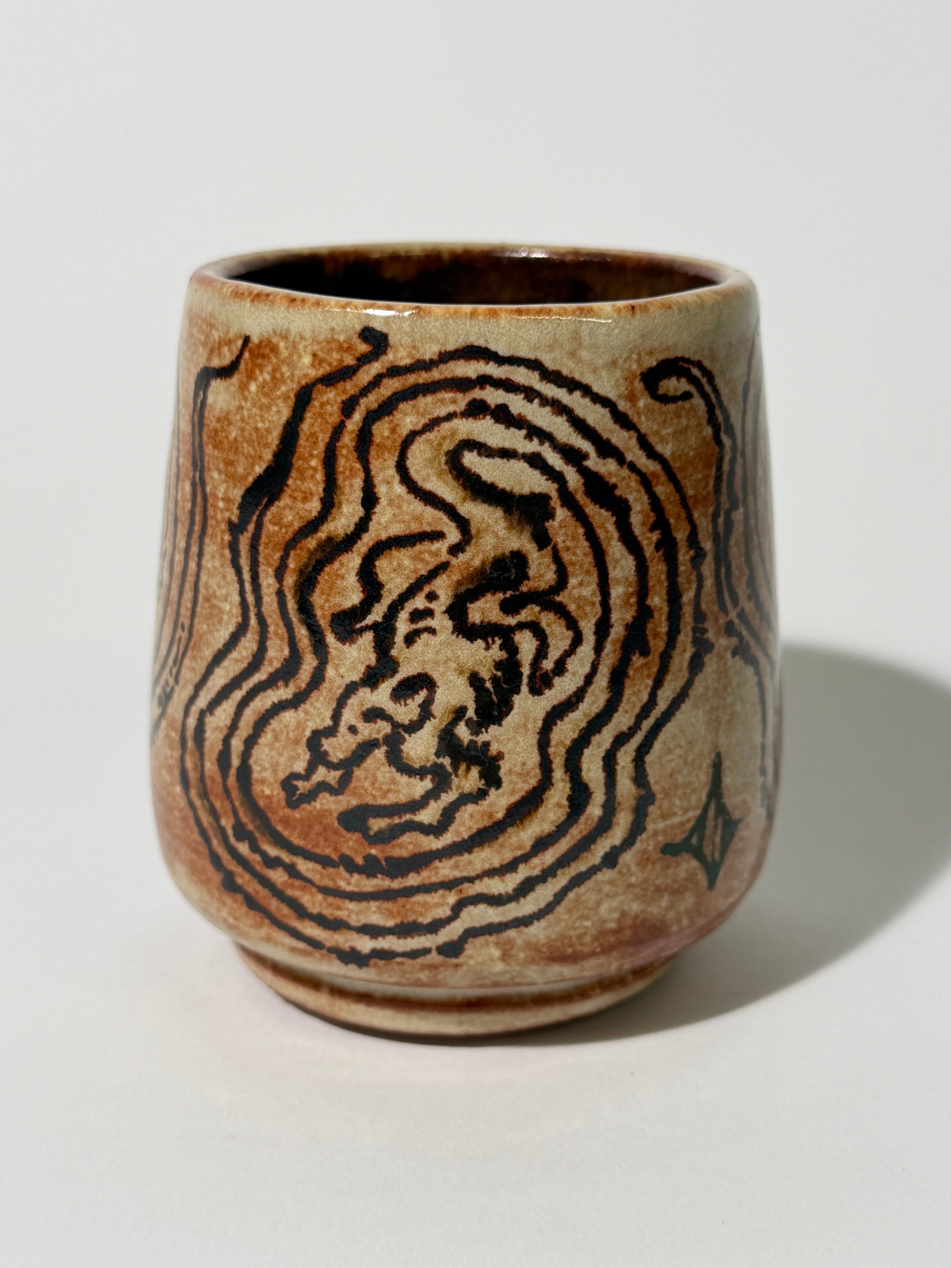 Hand thrown, painted, and glazed stoneware cup. Food safe, hand wash only.