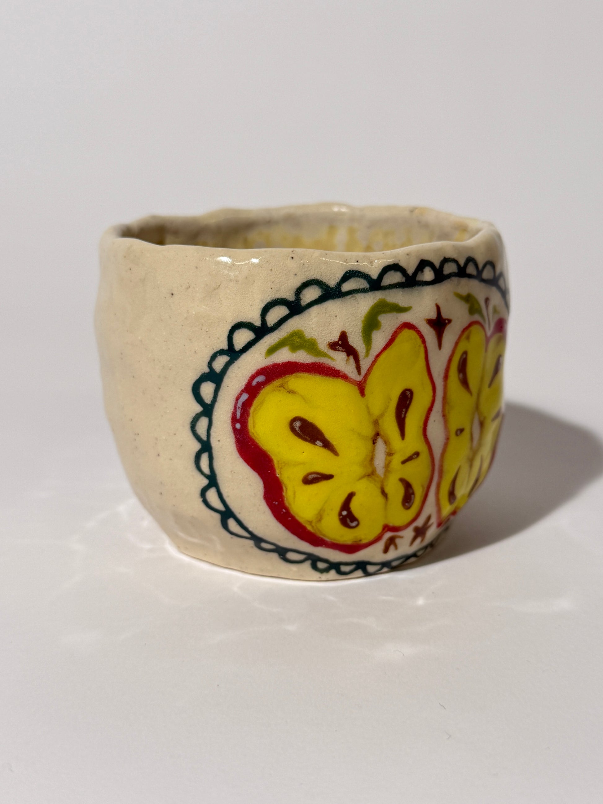 Hand thrown, painted, and glazed stoneware cup. Food safe, hand wash only.