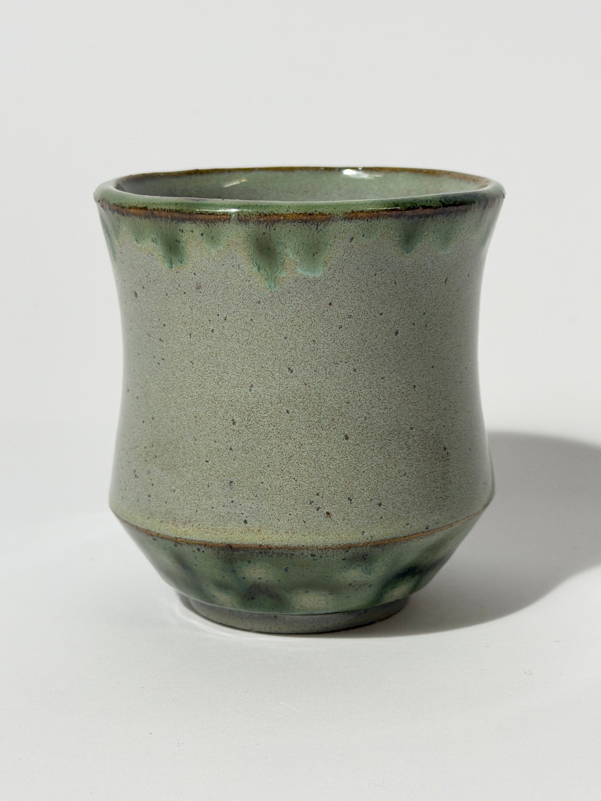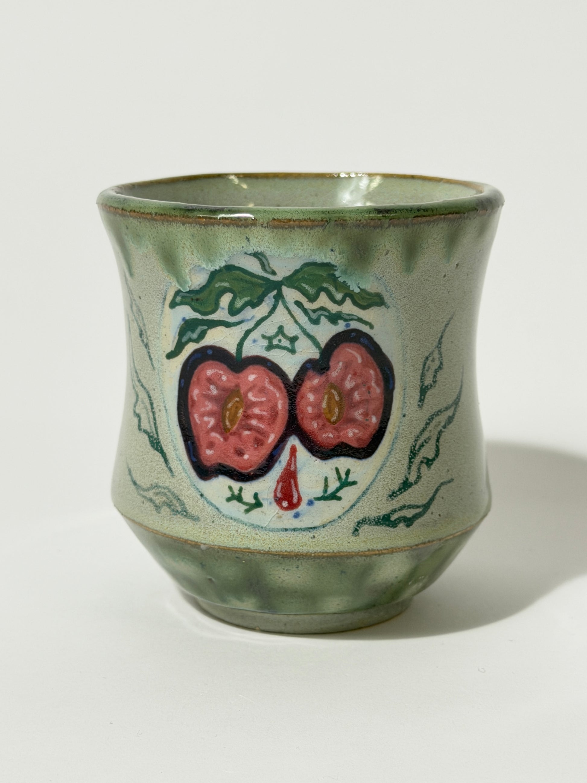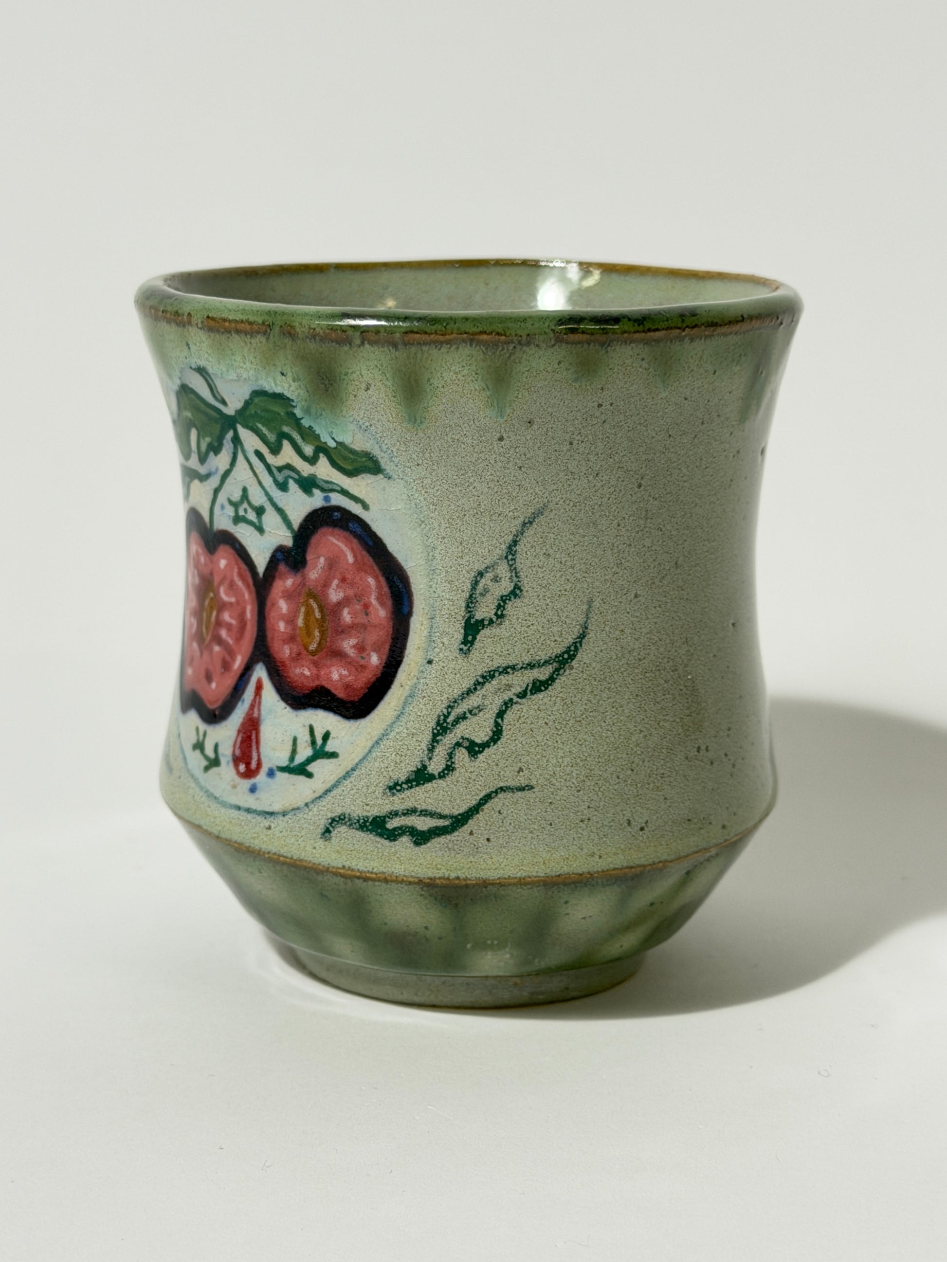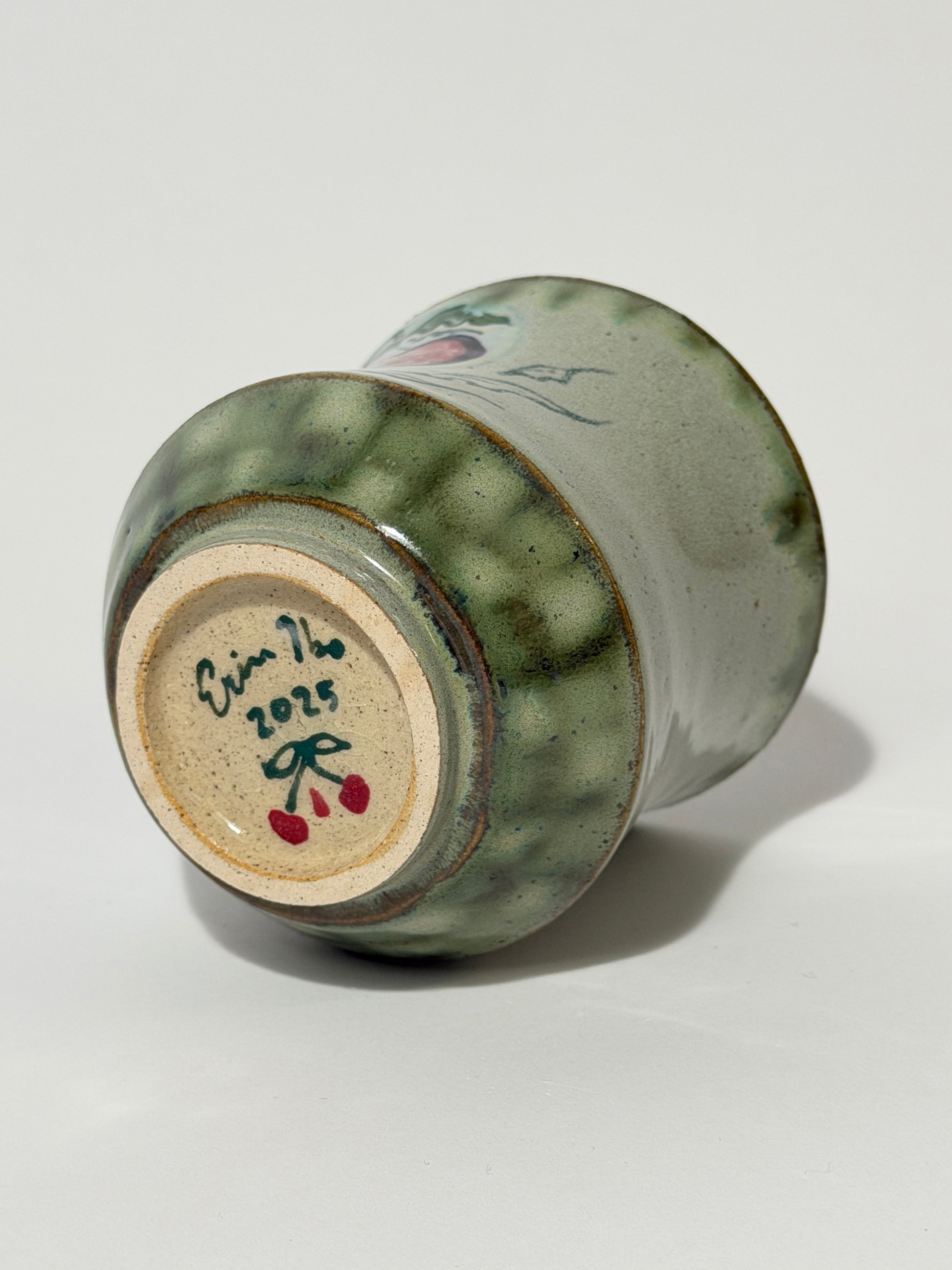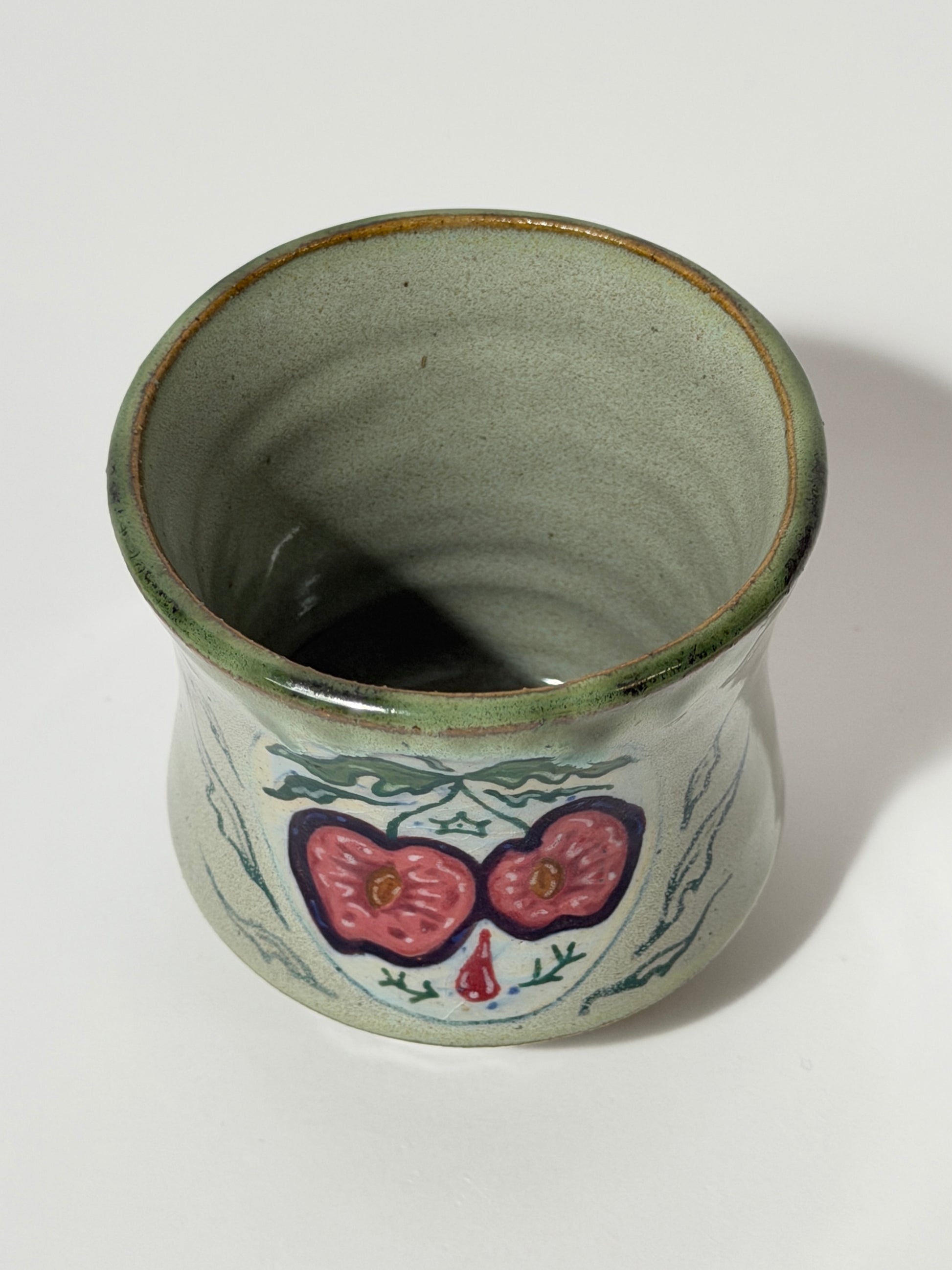 Hand thrown, painted, and glazed stoneware cup. Food safe, hand wash only.