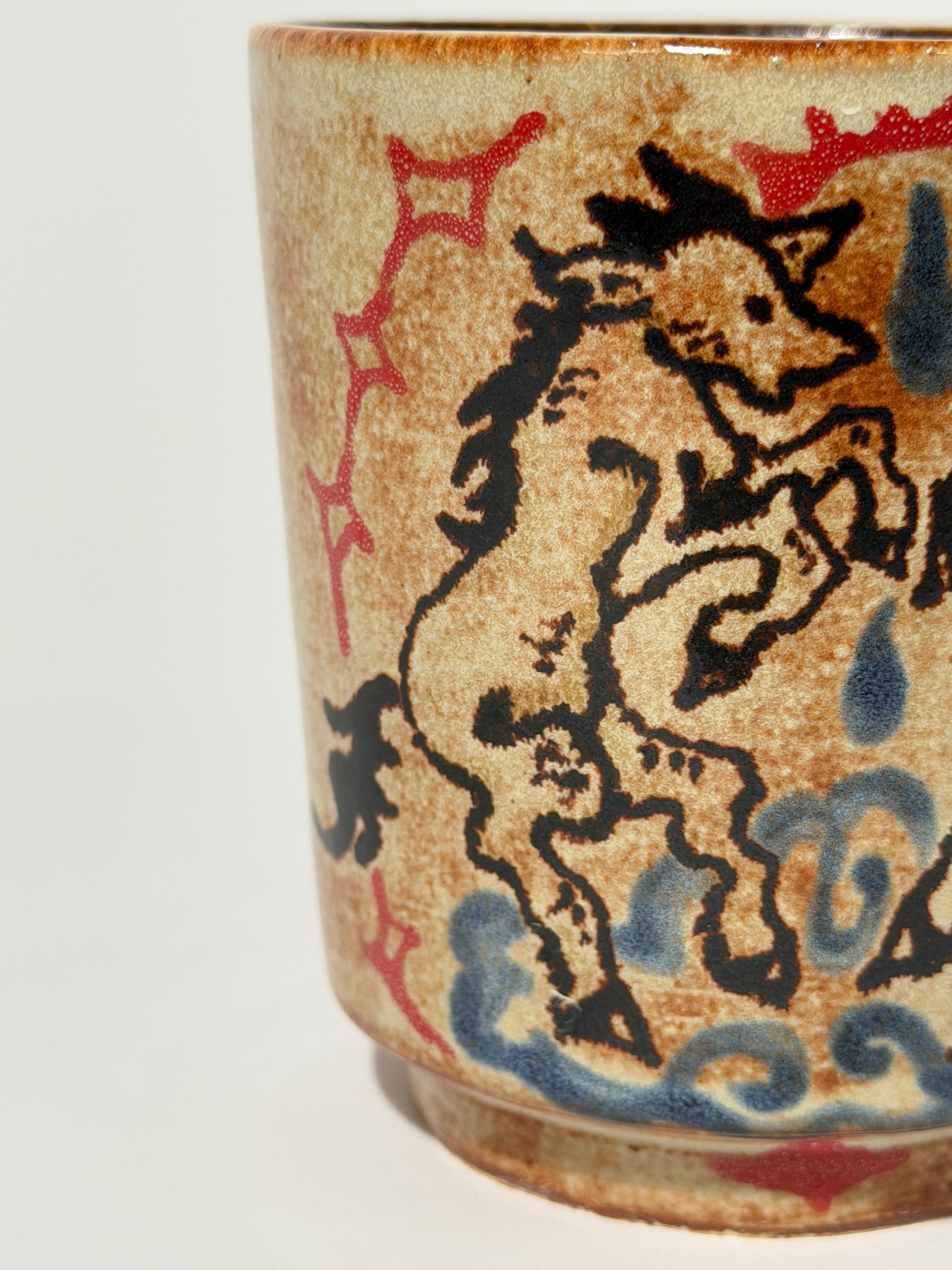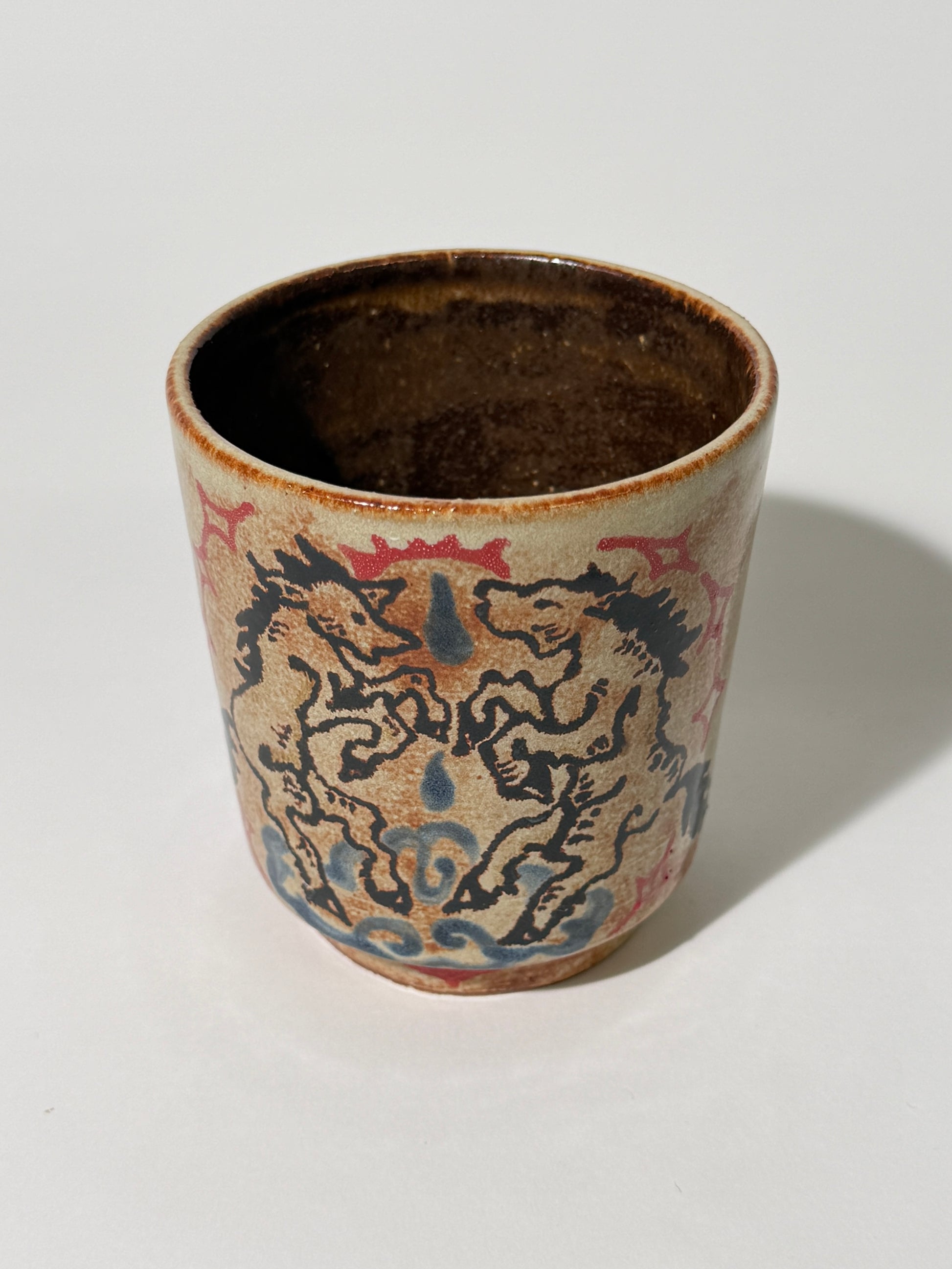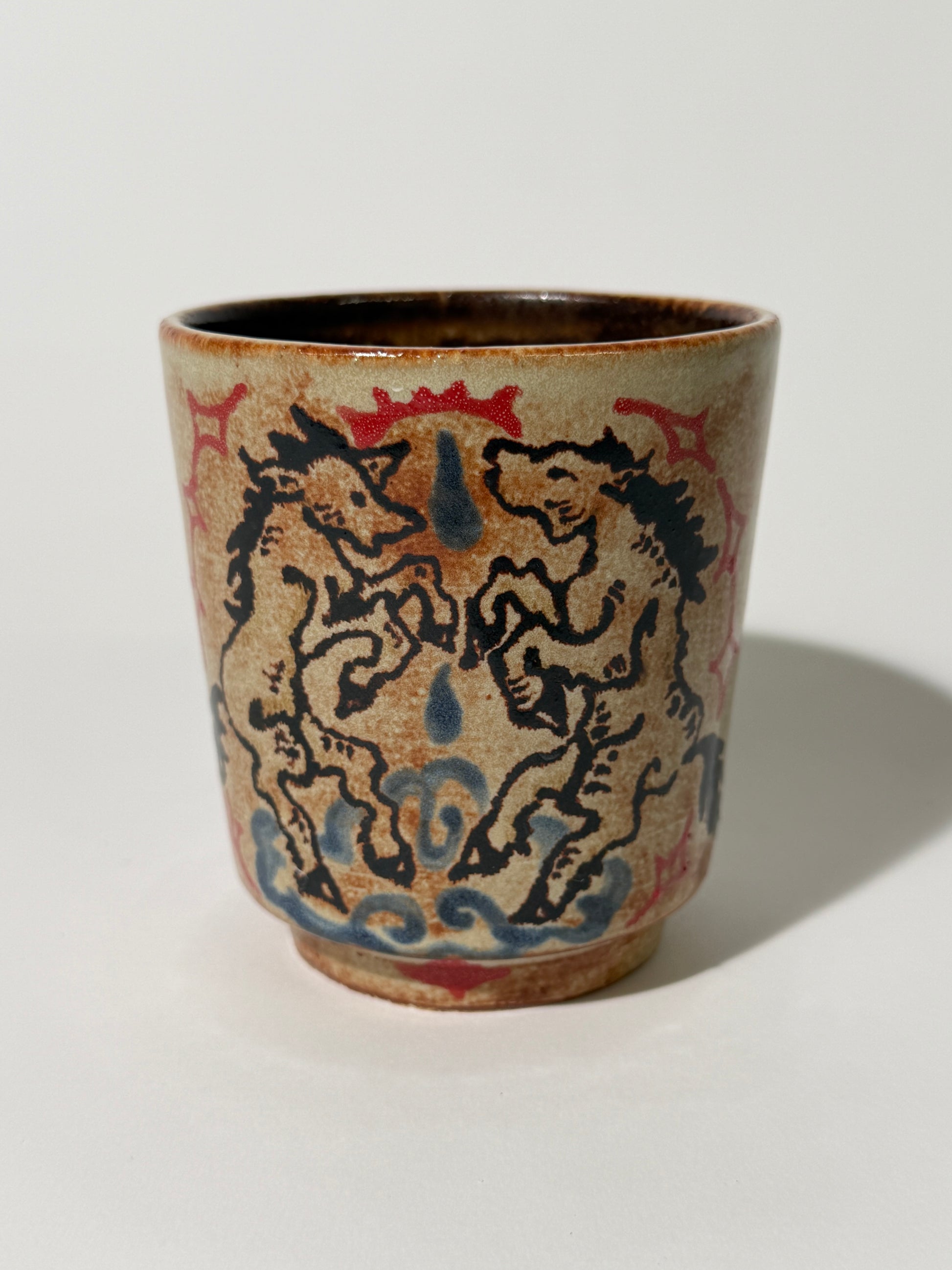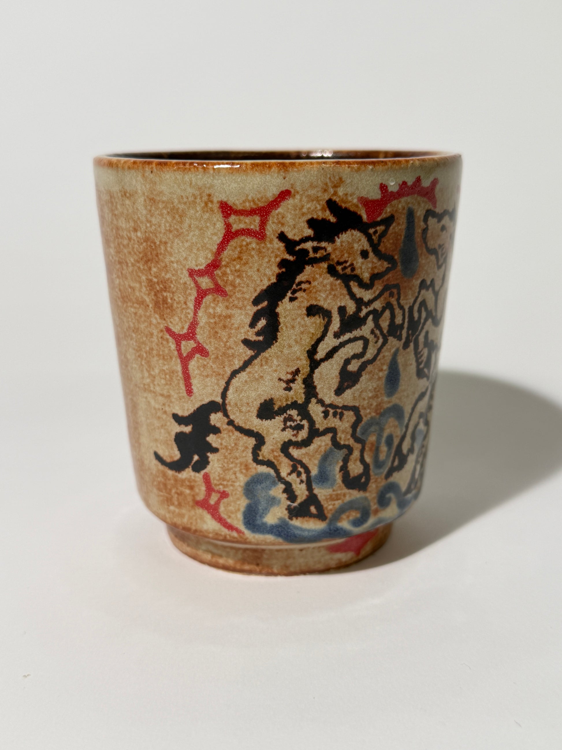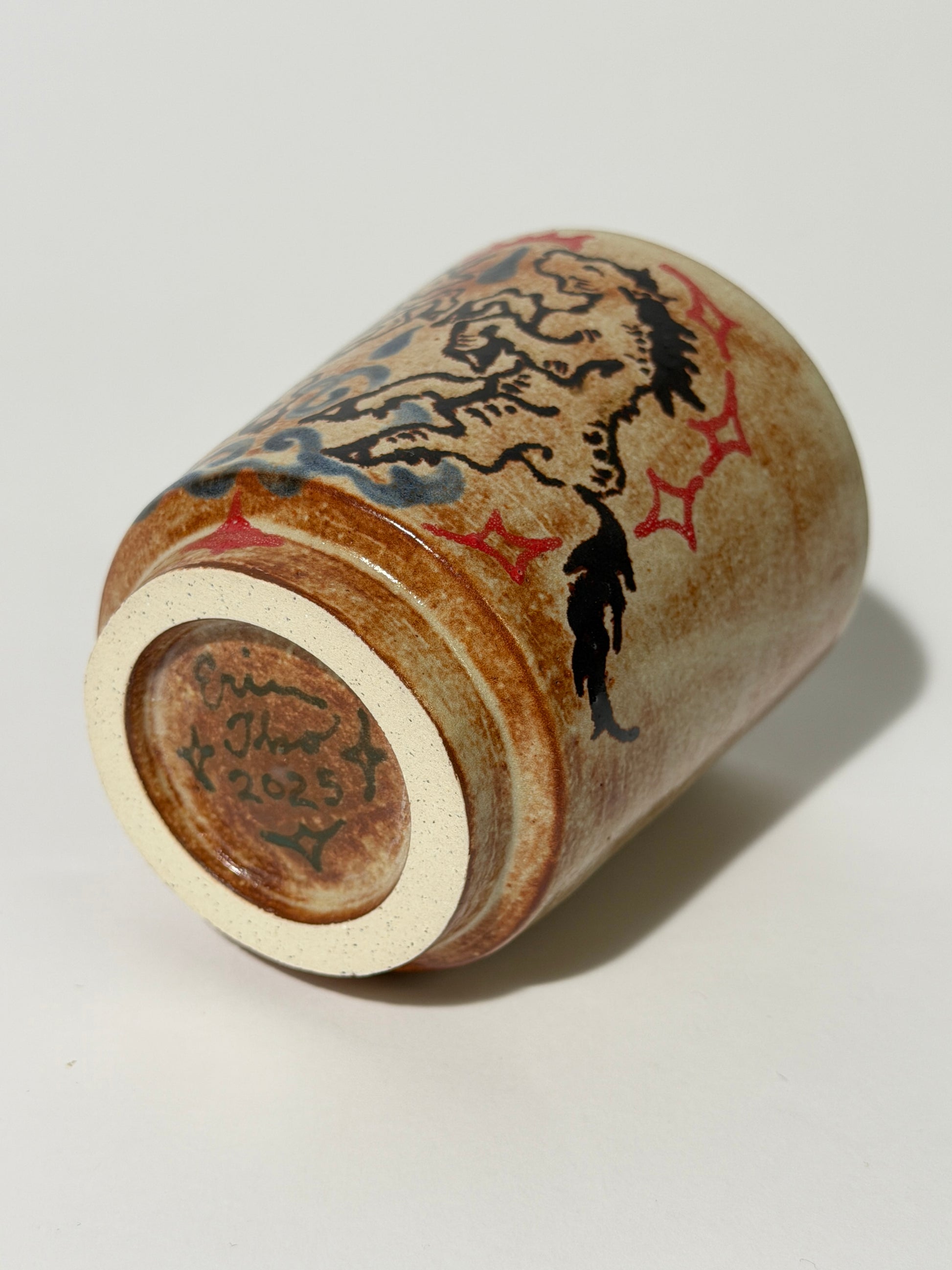 Hand thrown, painted, and glazed stoneware cup. Food safe, hand wash only.
