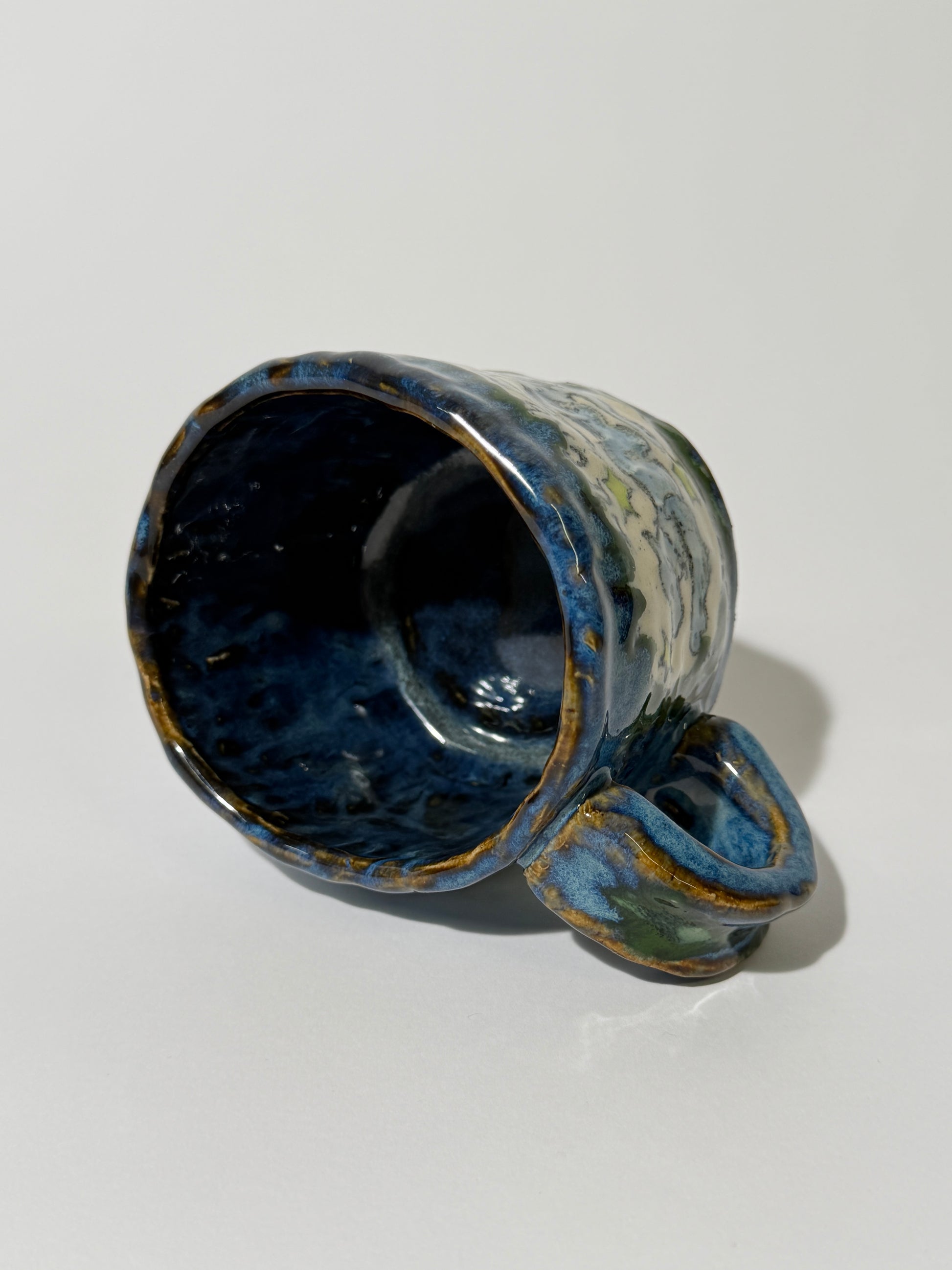 Hand pinched, painted, and glazed stoneware mug. Hand wash with care. Not recommended for use with food.