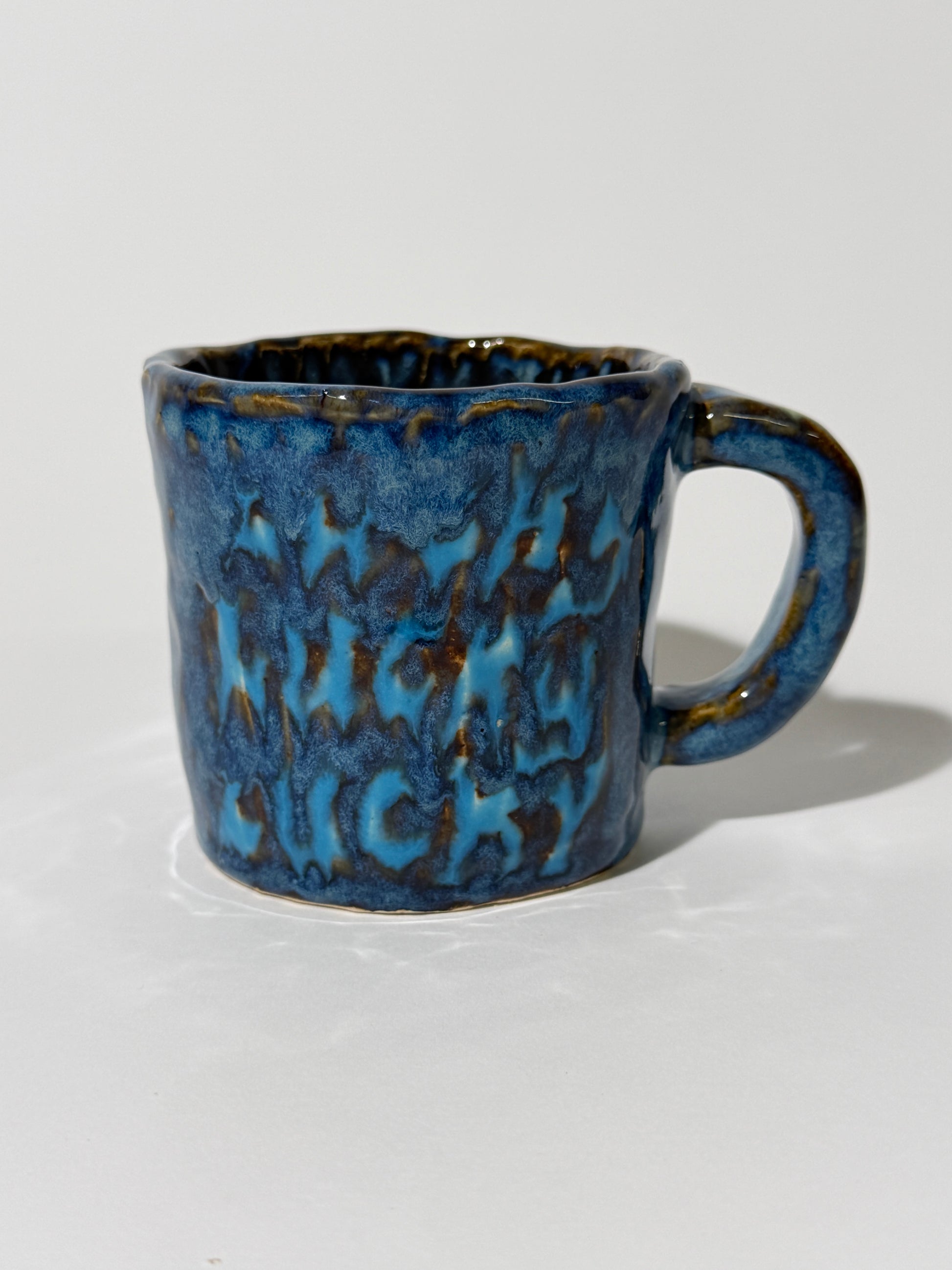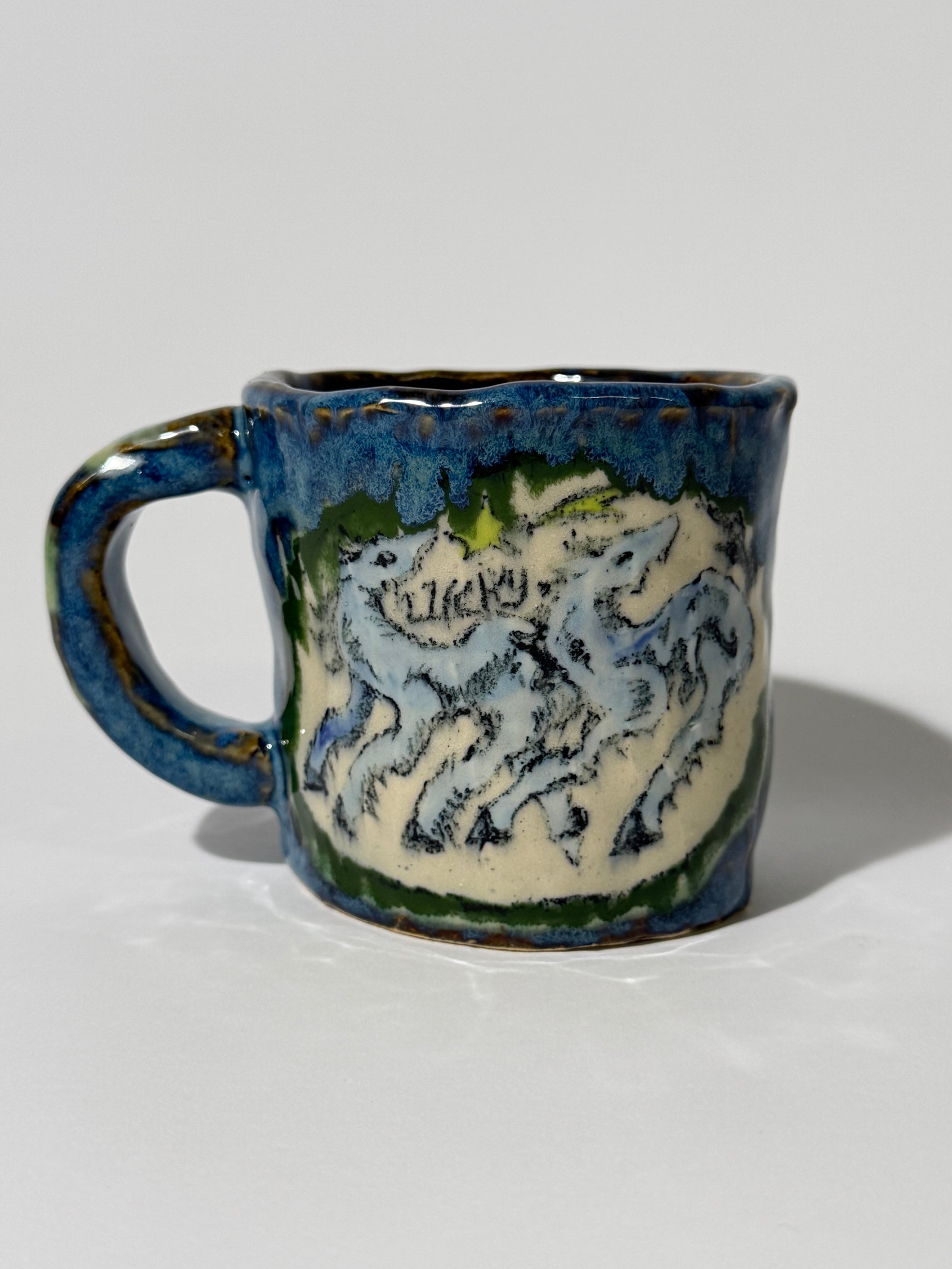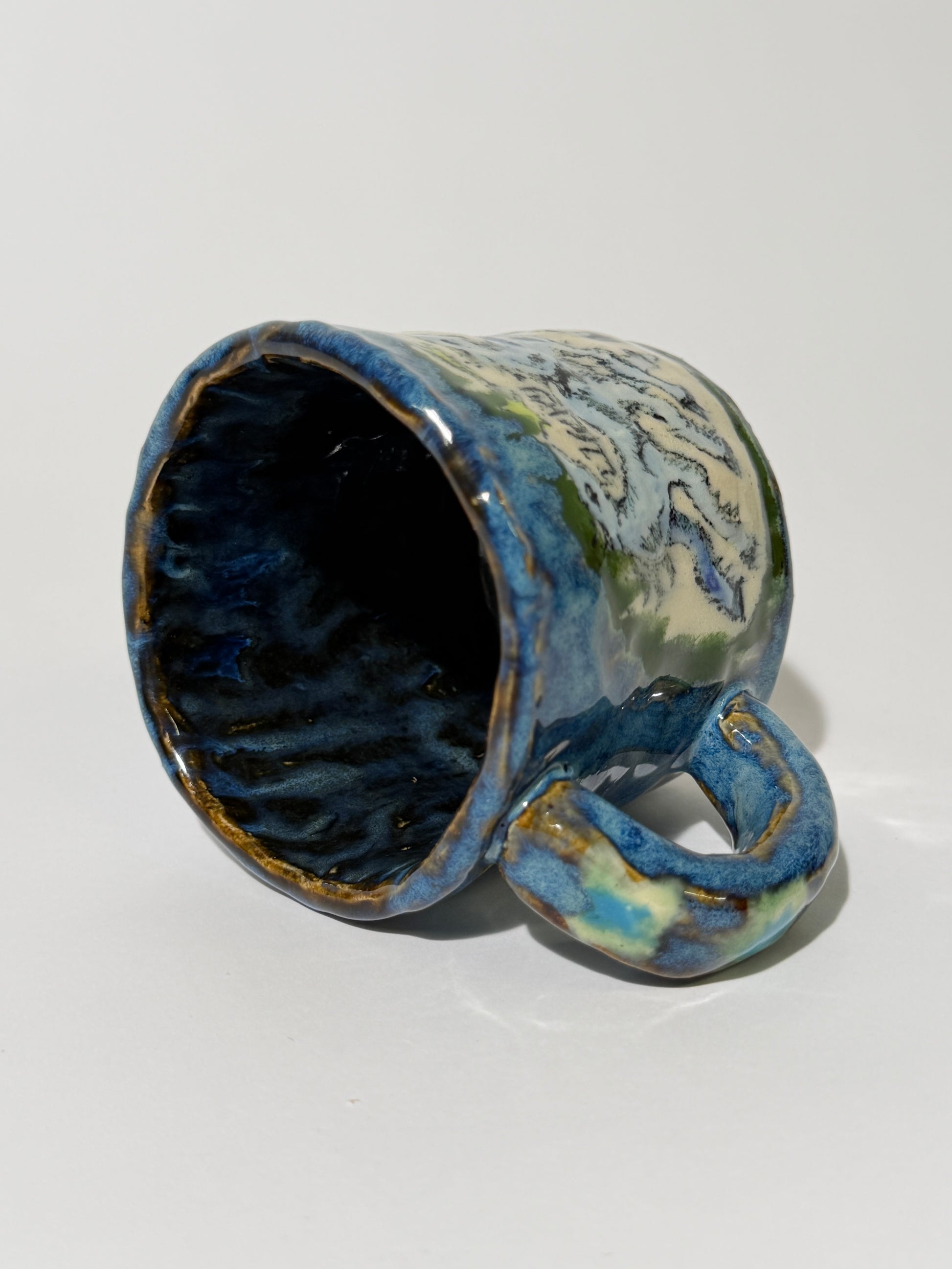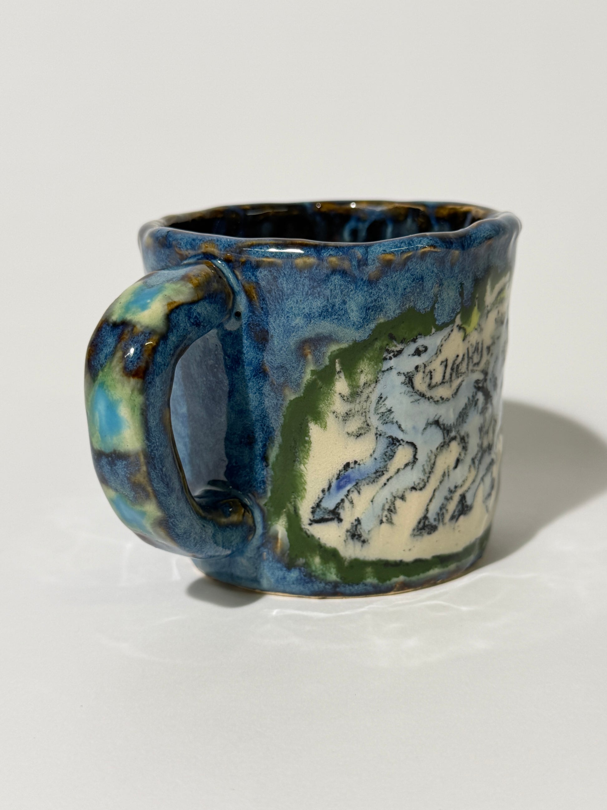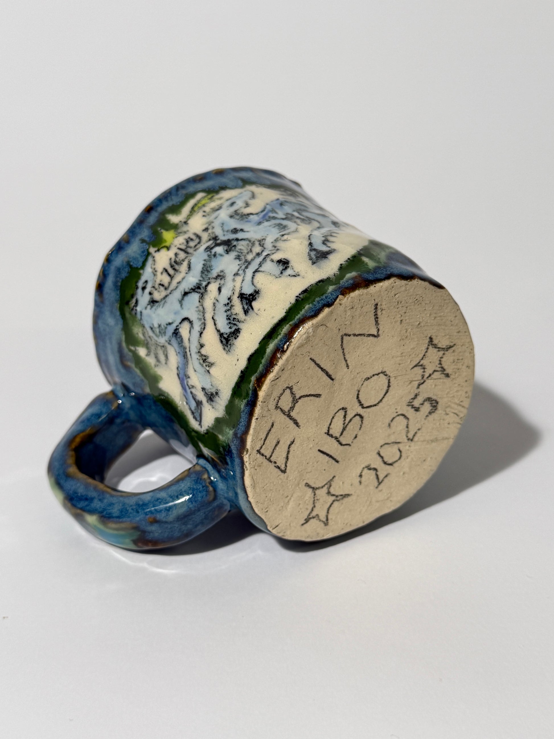 Hand pinched, painted, and glazed stoneware mug. Food safe, hand wash only.