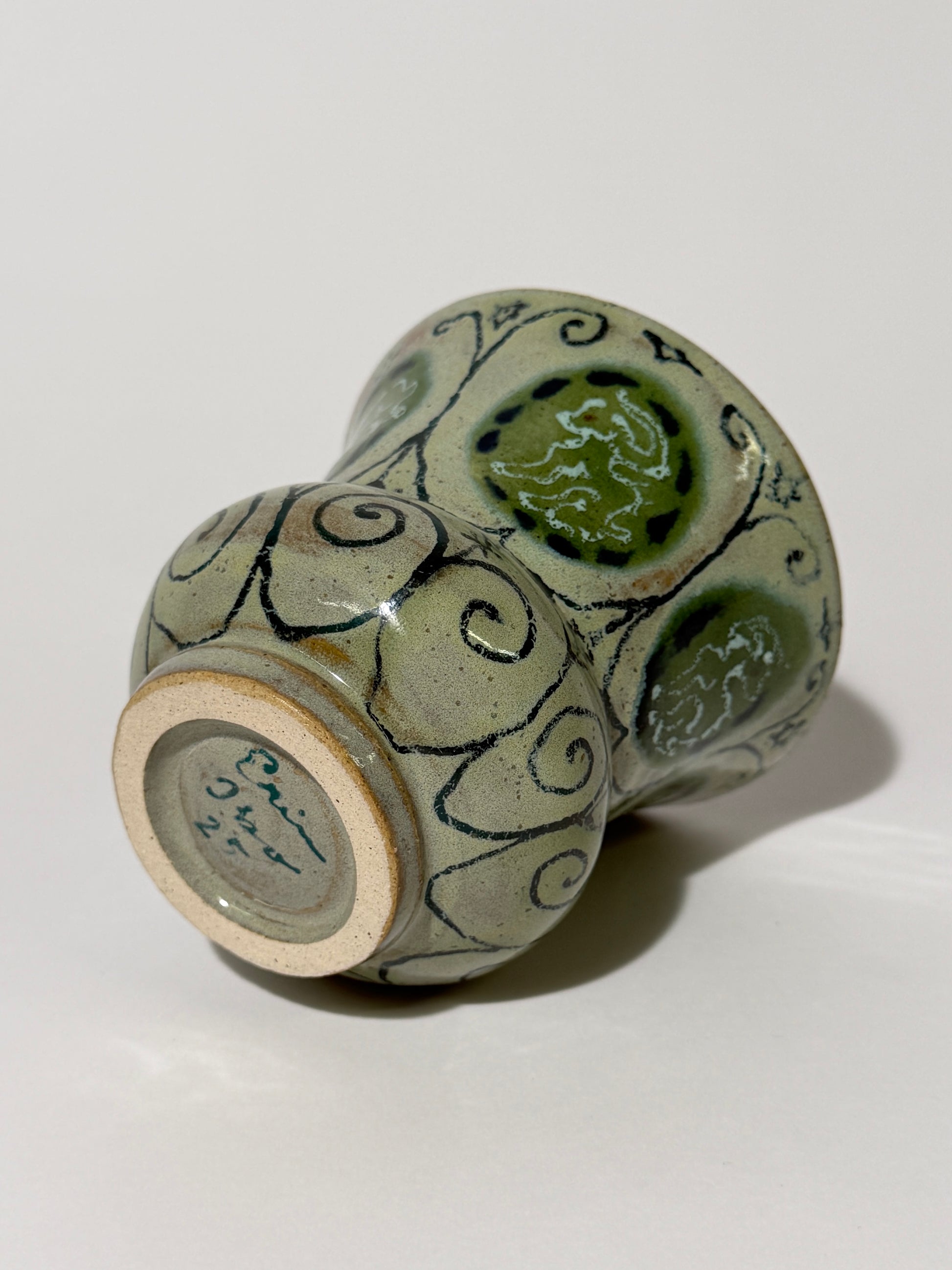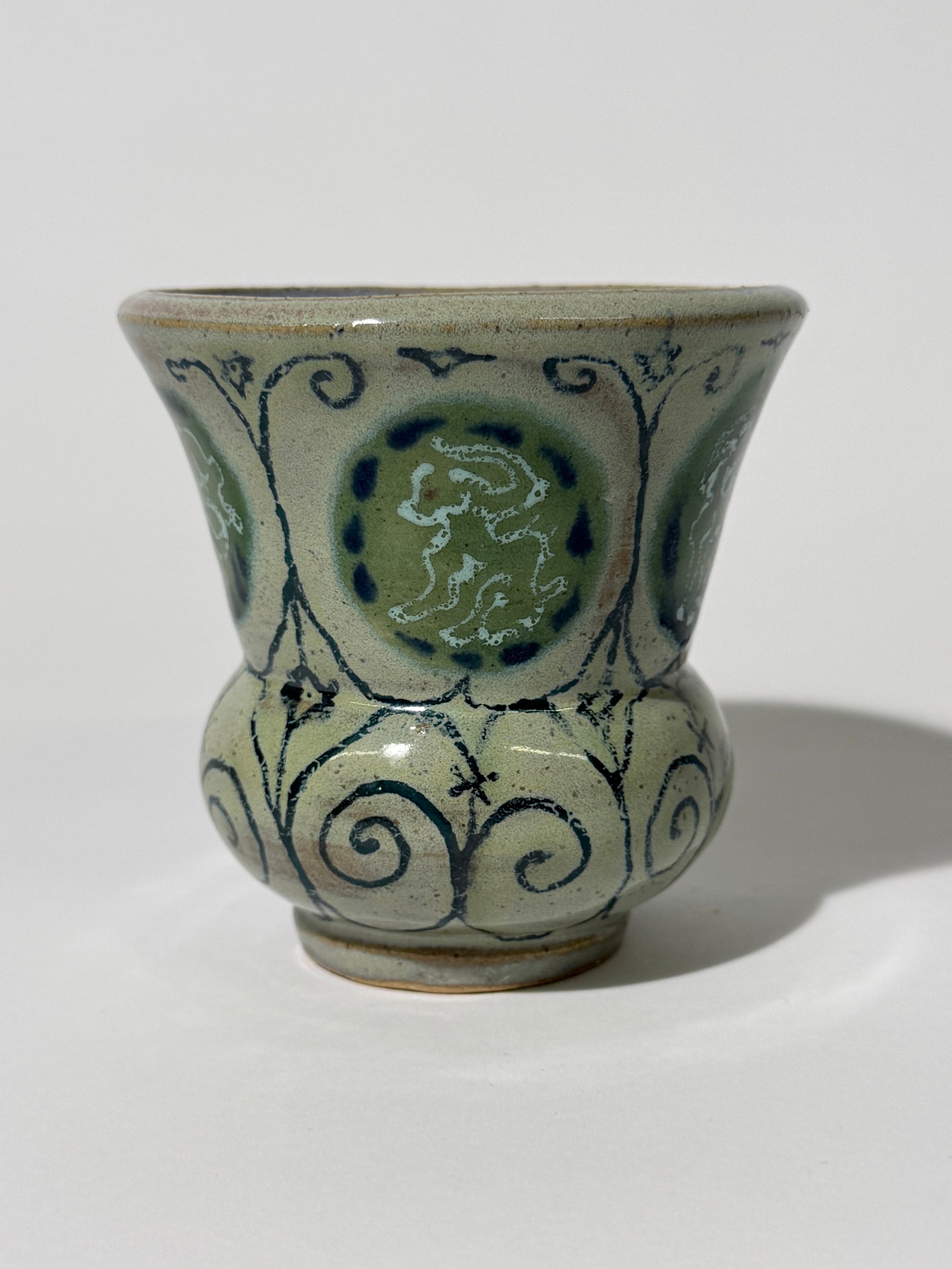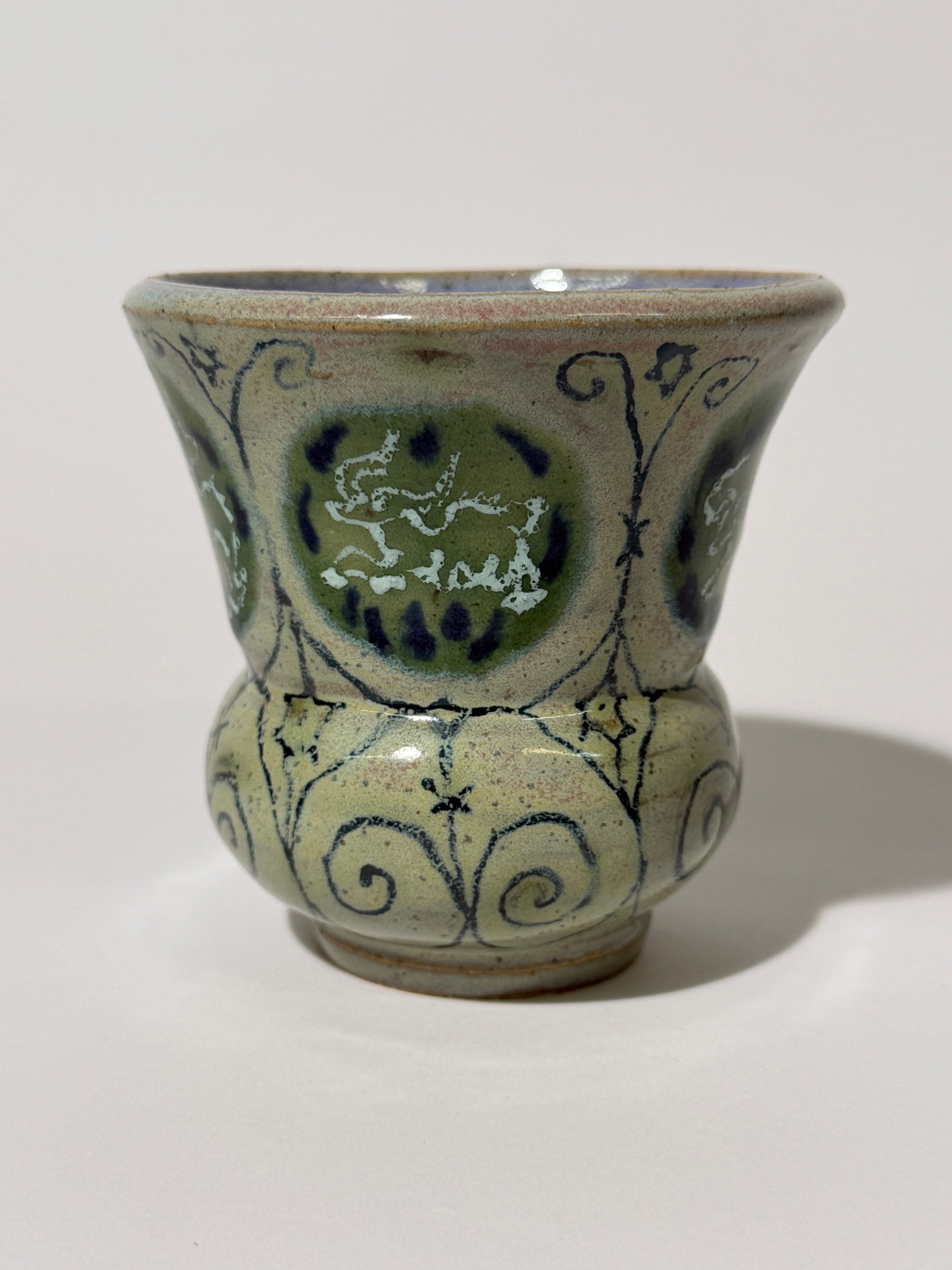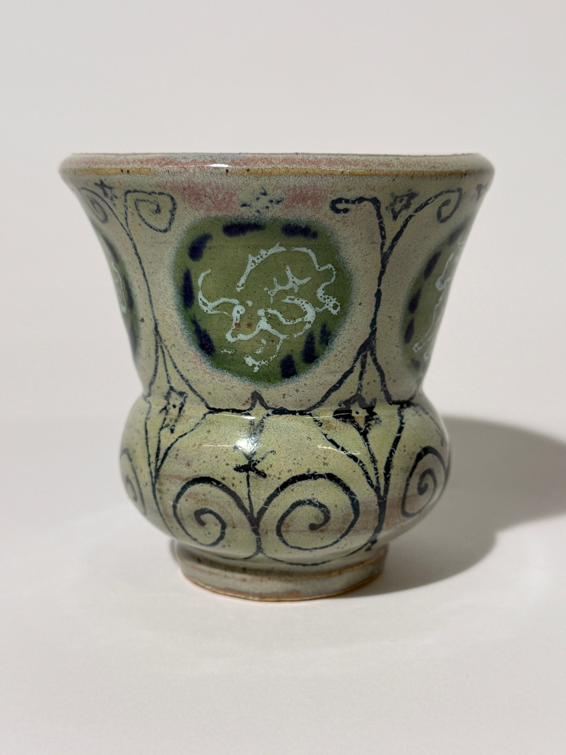 Hand thrown, painted, and glazed stoneware cup. Food safe, hand wash only.