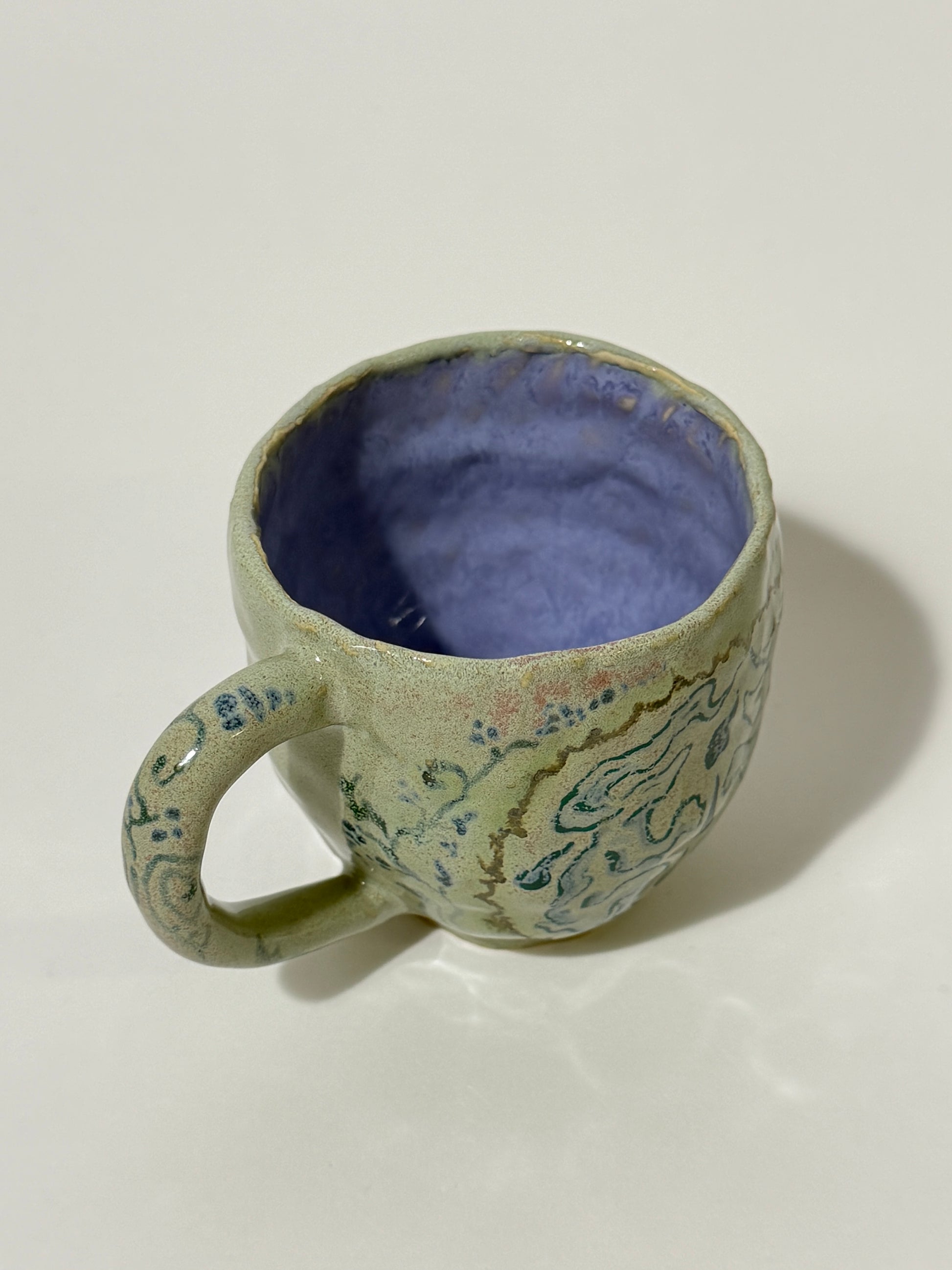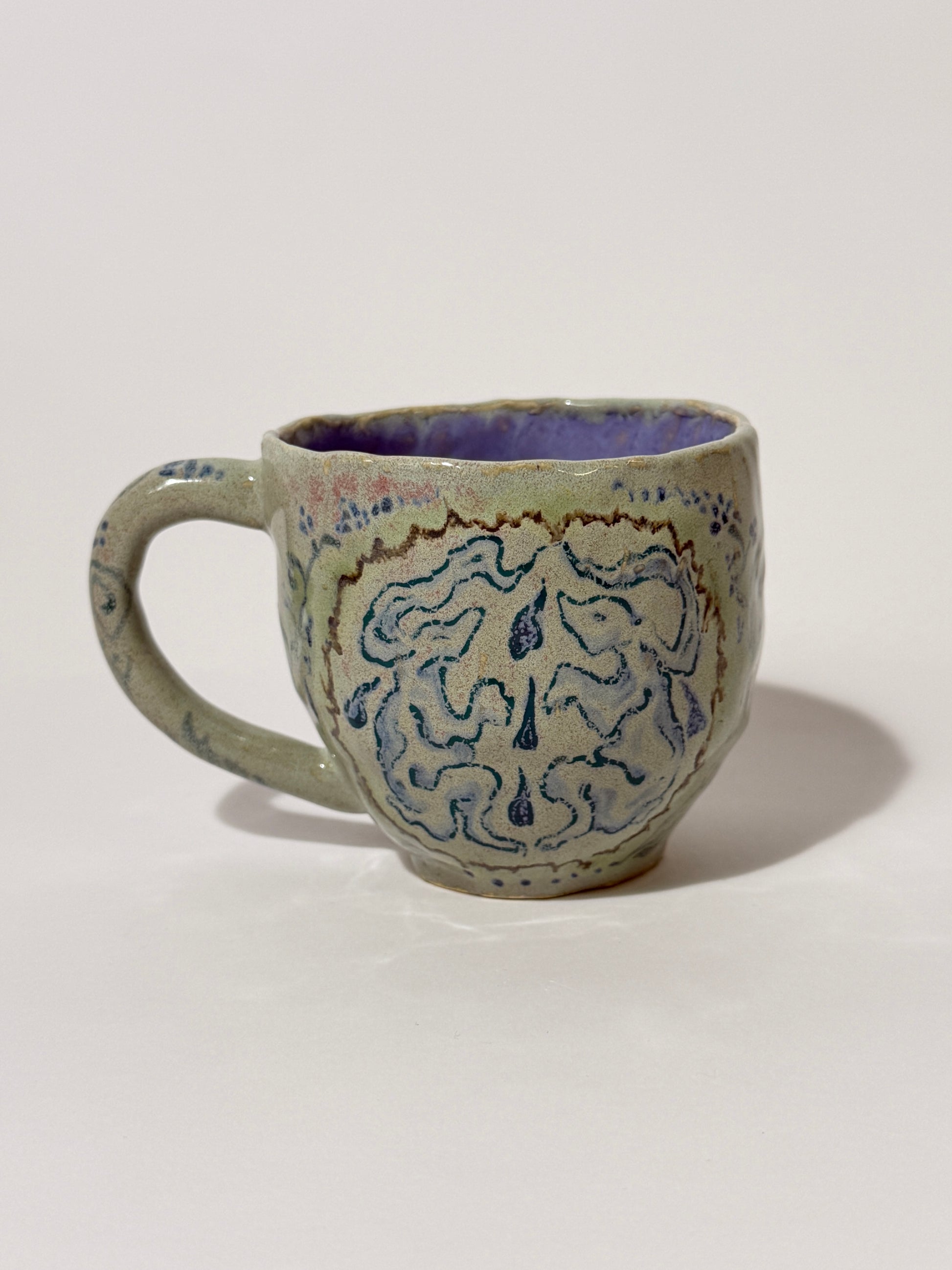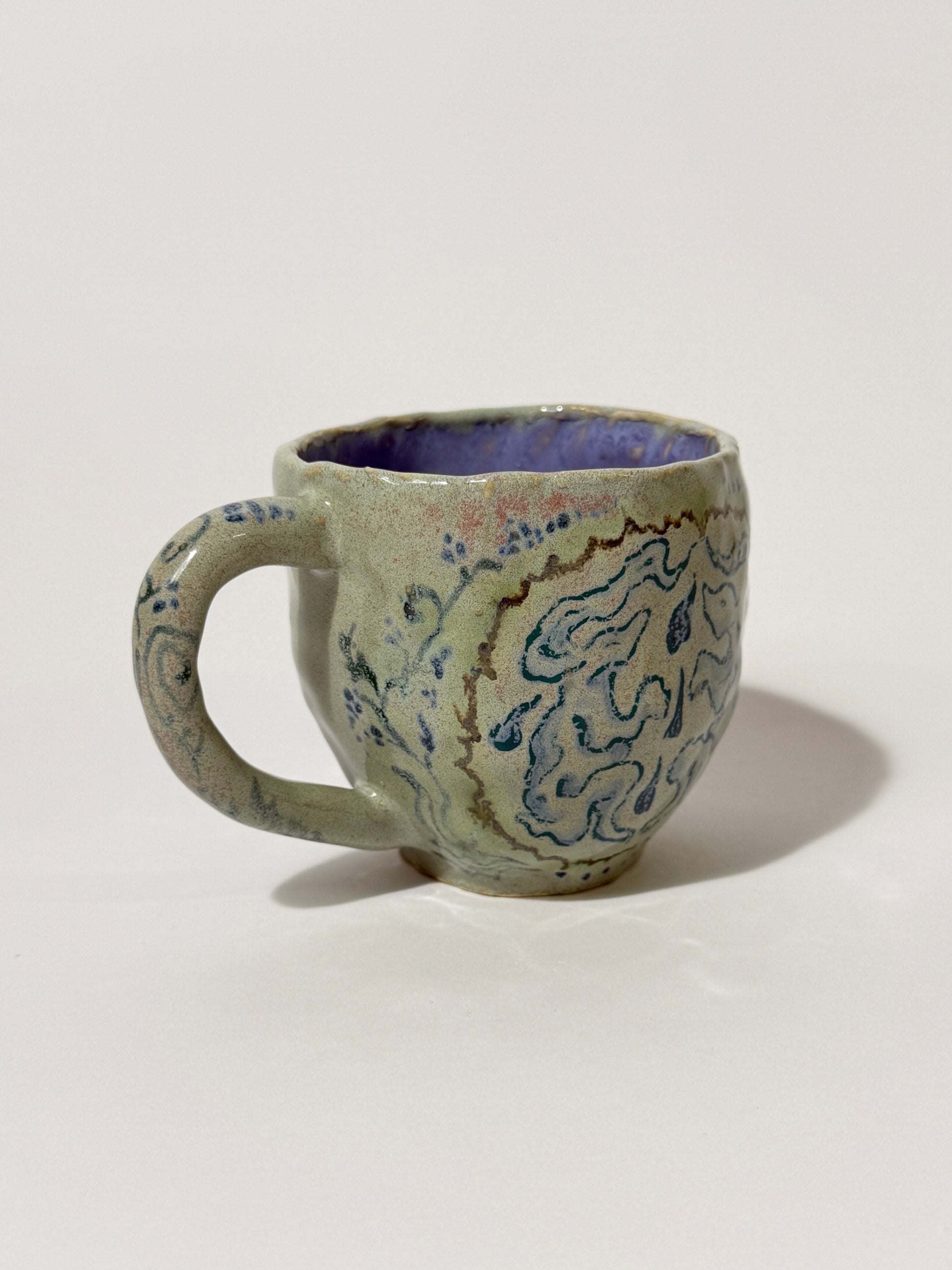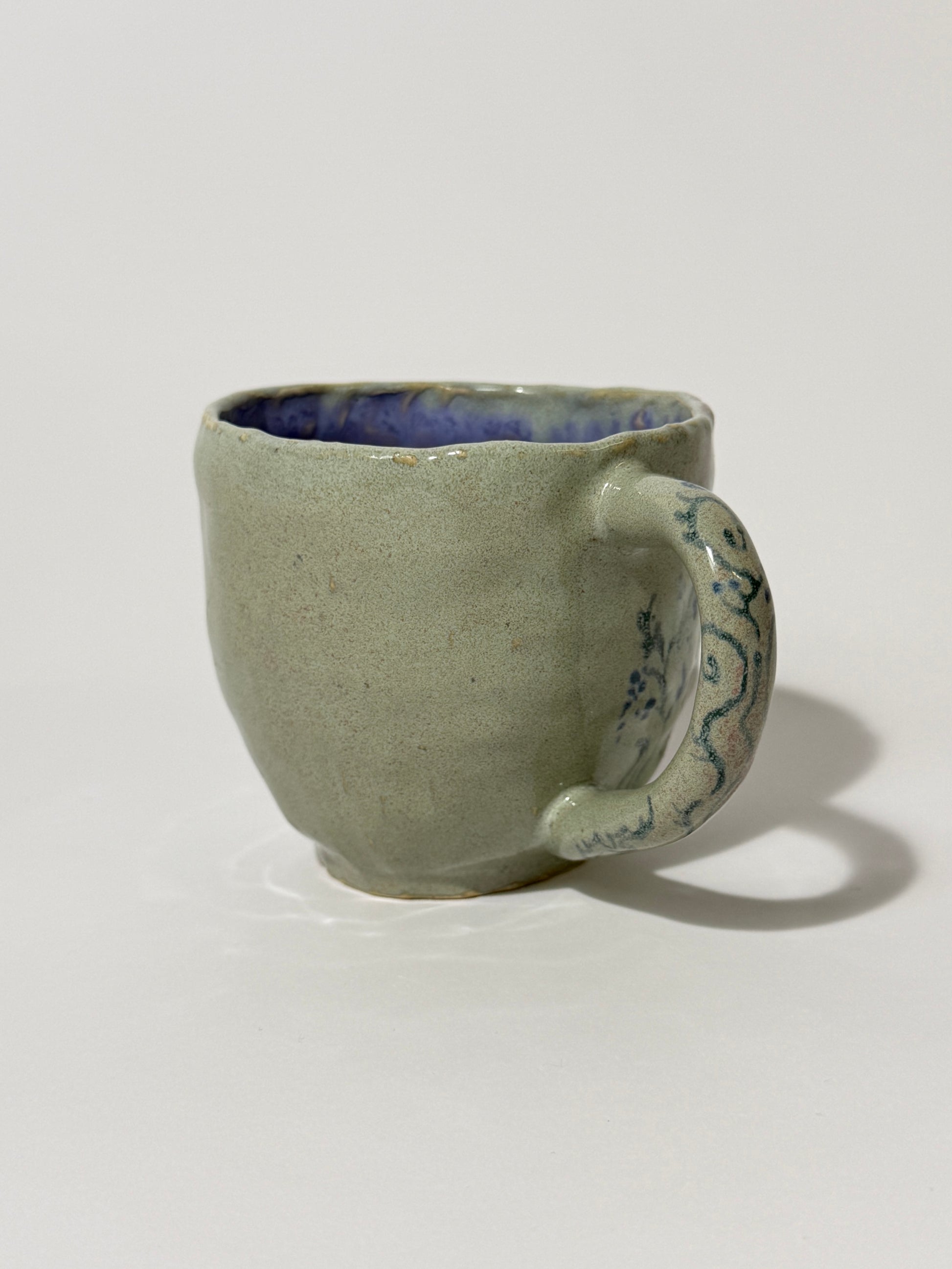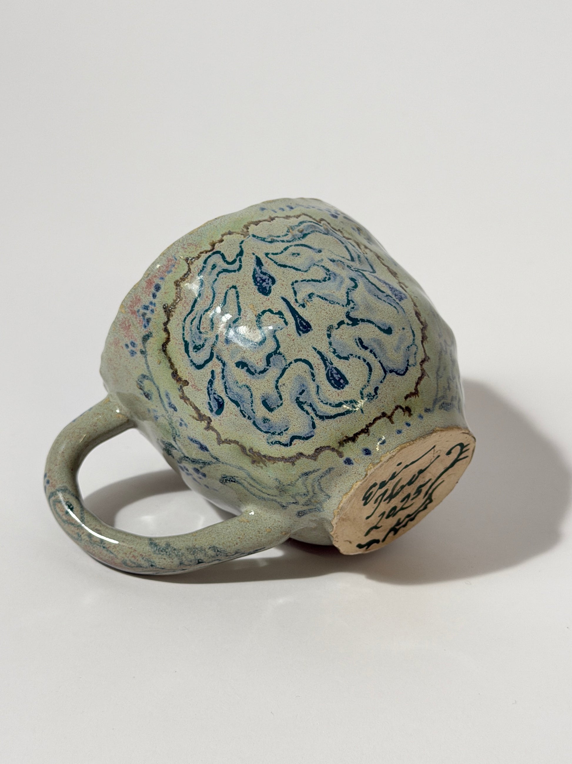 Hand pinched, painted, and glazed stoneware mug. Food safe, hand wash only.
